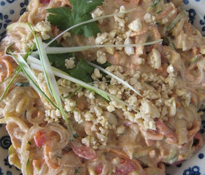 Mix sauce with vegetables and noodles until well combined. Serve in a beautiful bowl, garnished with the seasoned cashews, green onion and red pepper.