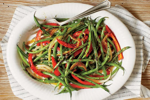 Cook 1 lb. fresh haricots verts (tiny green beans) in boiling salted water to cover 1 minute; drain. Plunge green beans into ice water to stop the cooking process; drain well, pressing between paper towels. Stir together 2 Tbsp. light brown sugar, 1 Tbsp. soy sauce, and 1/2 tsp. dried crushed red pepper. Sauté 1 medium-size red bell pepper, sliced; 1/2 medium-size sweet onion, sliced; and green beans in 1 tsp. hot peanut oil in a large skillet over high heat 3 to 5 minutes or until beans look blistered. Sprinkle with 3/4 tsp. seasoned salt. Remove from heat; add soy sauce mixture to green bean mixture, and stir to coat.