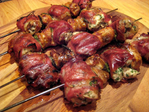 Lay each piece of rabbit onto a piece of prosciutto and roll it up. Skewer the rollup with a sage leaf and sausage piece, and continue until all ingredients are on the skewers.