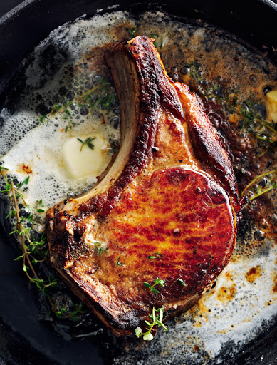 Carefully drain fat from skillet and place over medium heat. Add butter, 2 unpeeled garlic cloves, and remaining thyme sprig; cook until butter is foamy. Carefully tip skillet and, using a large spoon, baste chop repeatedly with butter until butter is brown and smells nutty, 2-3 minutes.