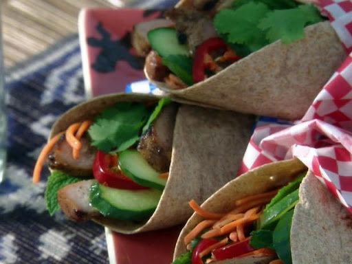 Banh-mi Wrap: Vietnamese Grilled Pork Wrap with Pickled Carrots and Mint