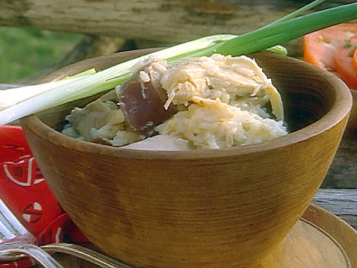 Slice the sausage into 1/2-inch pieces. In a stockpot, combine the chicken, sausage, onion, butter, seasonings and bay leaves. Add the water, bring to a boil, cover, and cook at a low boil for 40 minutes. Remove the chicken from the pot and let cool slightly. Pick the meat from the bones, discarding the bones and skin. Add the rice to the pot and bring to a boil, stirring well. Boil for 10 minutes, then reduce the heat, cover the pot, and simmer for 10 minutes, or until the rice is done. Remove the bay leaves, and return the chicken to the pot.