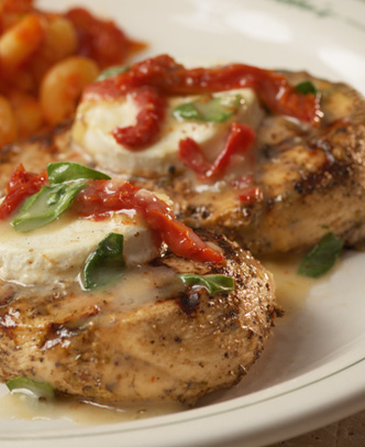 MELT GOAT CHEESE ON TOP THE LAST FEW MINUTES. SPOON MIXTURE OVER CHICKEN.