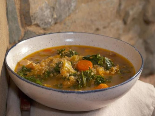 Heat the olive oil in a large pot over medium heat. Add the chicken, quinoa, celery, carrots, sweet potato, onion, Yukon gold potato and some salt and pepper to the pot. Top with the Beef Bone Broth and bring to a simmer. Cover and cook until the vegetables are tender and the chicken and quinoa are cooked through, 12 to 15 minutes. Stir in the oregano, thyme, sage and kale and cook until the kale is tender, another 3 minutes.
