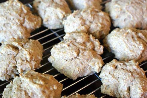 mix all ingredients. let stand 10 minutes. drop with tablespoon onto lightly greased cookie sheet. bake at 425 until brown on bottom. broil if necessary at the end to brown tops.