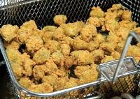 5.Pour oil to a depth of 2 1/2 inches in a Dutch oven or cast-iron skillet. Heat to 365° over medium-high heat on stovetop. Fry okra, in batches, for 6 to 7 minutes or until golden brown; drain on paper towels.