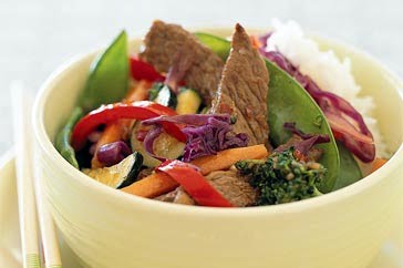 Cook rice as directed. Toss steak with 2 rsp of soy sauce. Heat 1 teaspoon oil in nonstick frying pan over medium high heat. Add ginger and garlic. Cook stirring for 30 seconds. Add steak and cook 2-3 minutes. Transfer to plate. Add 1 tsp oil to pan and cook carrots, onion and pepper until soften, about 3 minutes. Stir in snow peas and almonds and cook an additional 2 minutes. Add beef and juices and hoisin sauce and remaining 1 tsp soy sauce. Cook stirring one minute and serve over rice