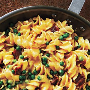 2. Place pan over low heat. Stir in bacon, pasta, and peas; cook for 1 minute or until thoroughly heated, tossing to coat.