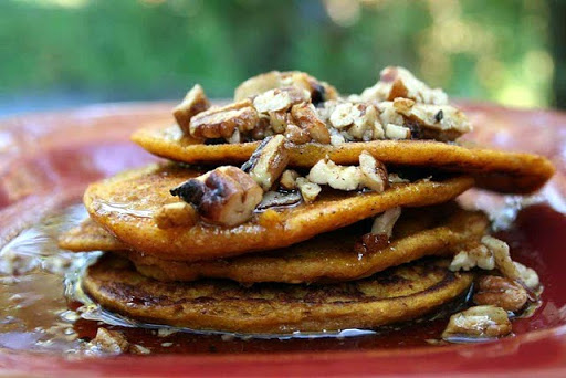 Pumpkin Pancakes with Cinnamon, Brown Butter, Pecan Topping
