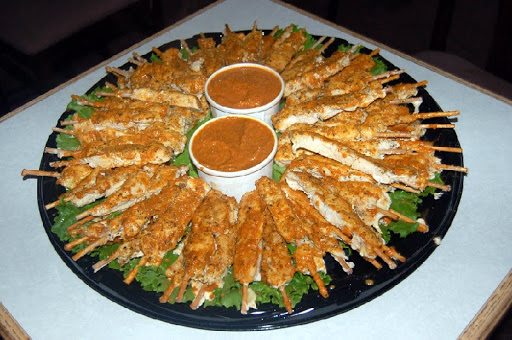 Pound chicken breasts between pieces of plastic wrap to a uniform thickness. Rub each breast with about 1 tablespoon of light soy sauce. Then season both sides of each breast with a couple pinches of salt and pepper. Place in a skillet and grill a couple minutes per side. Remove and cut into strips or cubes and thread onto skewers. Dip into peanut sauce