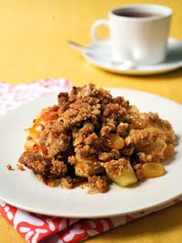 3. In another bowl, combine sugar, flour, oats, butter and pumpkin pie spice; mix until crumbly. Scatter over apple mixture.