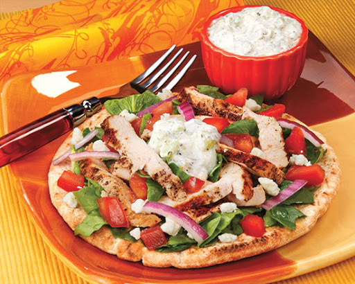 Season the chicken breasts with salt and pepper, SPEARMINT and OREGANO to taste. The larger amounts will give stronger flavor, especially the SPEARMINT. If you have time, it tastes even better to cover and refrigerate for 30-60 minutes before cooking. Heat the olive oil in a pan over medium-high heat. When quite hot, but not smoking, place the chicken breasts in the pan. Turn after 5 minutes or so, continue cooking (possibly turning again) until the chicken is cooked through. You can also cook these on the grill. Serve hot, room temperature or chill for later. Slice the chicken about 1/2-3/4-inch thick and divide among the 4 pieces of pita bread. Top with Tzatziki sauce, sliced onion, spinach, tomato and feta.