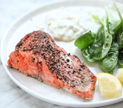 Rinse the salmon under cold water and pat dry with a paper towel. Run your fingers along the meaty surface to check for any bones and remove any of them with needle nose pliers or fish tweezers.
