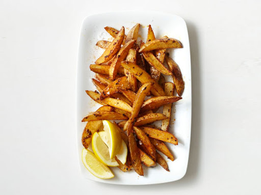 Preheat a rimmed baking sheet in a 450 degrees F oven. Cut 3 large russet potatoes into wedges and toss with salt and 2 tablespoons vegetable oil; arrange cut-side down on the hot baking sheet. Roast until golden brown on the bottom, 30 minutes, then flip and sprinkle with 1 sliced garlic clove and 1 teaspoon each ancho chile powder and dried oregano. Roast 15 more minutes. Serve with lemon wedges.
