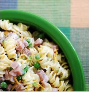 Whisk the ranch dressing, mayonnaise and seasoning salt. Toss the dressing with the pasta and then gently stir in the ham, peas, cheese and bell pepper. Taste and add more seasoning salt, if needed. Refrigerate several hours or overnight.