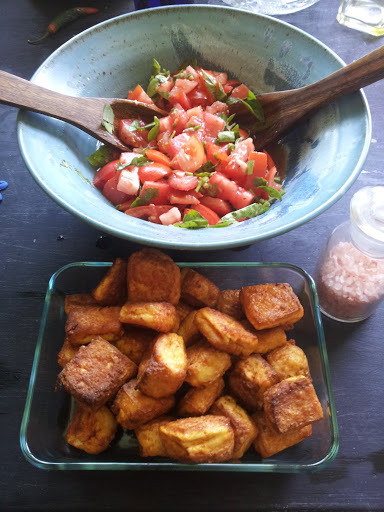 • cubed, baked tofu, coated in olive oil, smoked paprika and seasalt, 15 minutes per side at 425 F (30 mins total)
