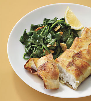 Heat 3 tablespoons oil in each of 2 large skillets over medium-high heat. Set 3 wrapped fish fillets, seam side down, in each skillet. Cook until golden on bottom, about 3 minutes. Turn; cook until fish is opaque in center, 2 to 3 minutes longer. Transfer to plates; cover to keep warm.