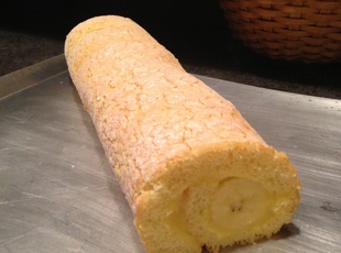 5. TO ASSEMBLE: Place 2 or 3 straight bananas near edge (2 inches) of long side of roll and roll up again. Be sure to use bananas that have absolutely no black or brown specks on them and that they are not too ripe, but still slightly hard.