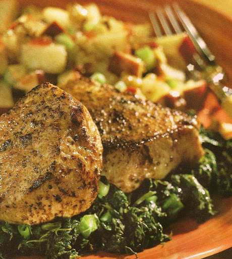 Add lemon juice and green onions to skillet; stir in spinach. Cook, stirring constantly, 3 minutes, or until thoroughly heated. Arrange spinach evenly on plates. Top evenly with pork.