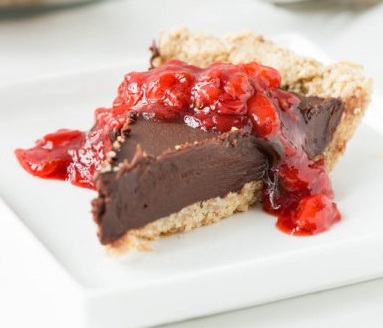 6. Assembly: Pour chocolate filling into pie crust and smooth out. Place in the freezer, on an even surface, for a minimum of 2 hours, or until firm throughout. Allow pie to sit on the counter for 15-30 minutes before attempting to slice. Slicing the first piece of pie is quite tricky, but I promise the second slice comes out much easier! Serve the pie chilled with the optional compote on top. Wrap leftover pieces of pie in tin foil and store in the freezer for up to 1 week.