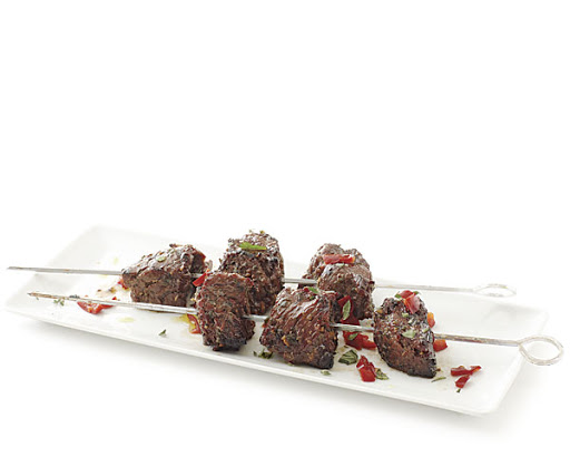 Prepare a gas or charcoal grill fire for direct grilling over medium-high heat (400°F). While the grill heats, thread the beef onto long metal (or soaked wooden) skewers, leaving a little space between the pieces, and let sit at room temperature.