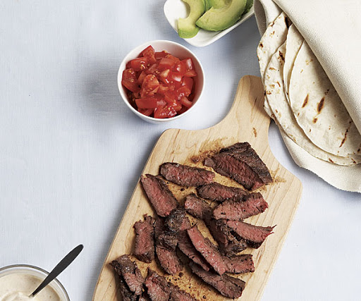 Meanwhile, warm the tortillas on the grill for about 30 seconds per side. Slice the steak across the grain into 1/4-inch-thick slices. Fill each tortilla with some of the steak, lettuce, tomato, avocado, and onion. Drizzle with the sauce and serve.