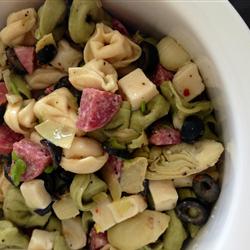 Place the tortellini, pepperoni, green onions, olives, artichoke hearts, and mozzarella cheese in a large salad bowl.