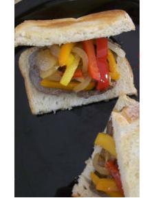 Assembly: Place two pieces of grilled steak on a slice of sourdough bread. Top with caramelized onions and bell pepper and serve immediately.