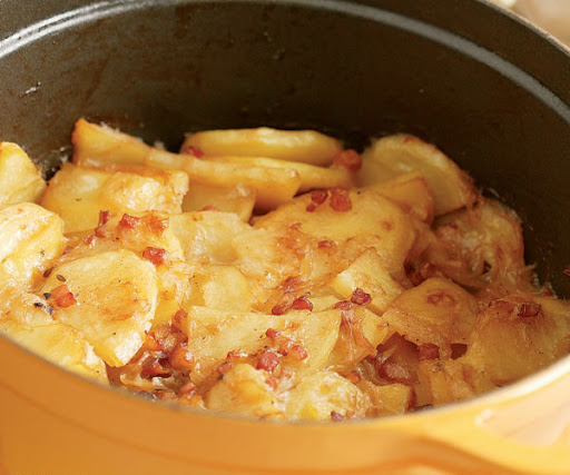 This dish is like a potato gratin but without the cheese and cream; the pancetta (Italian cured bacon) adds rich flavor. It would make a great side dish for roast chicken or beef