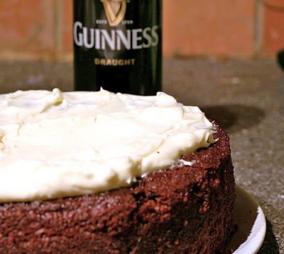 Yum! Chocolate Guinness cake topped with cream cheese frosting spiked with a splash of Irish whiskey.