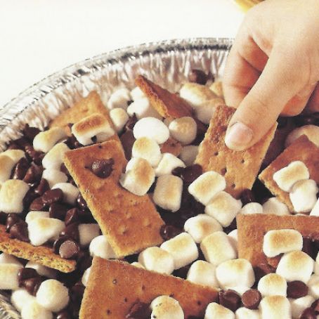 Break each graham cracker into 4 pieces. Pile pieces in ungreased metal pie pan. DO NOT USE GLASS. Top with chocolate chips and marshmallows.