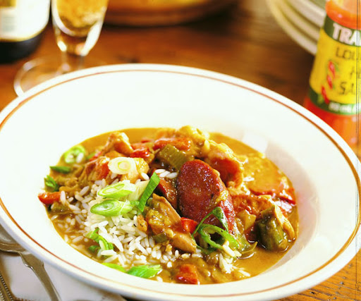 Return the soup to a boil and stir in the filé powder, stirring vigorously to avoid clumping, until the filé powder is dissolved. Taste for seasoning, adding salt and pepper as necessary. Serve the gumbo in bowls over the cooked white rice with chopped scallions and Tabasco to taste.