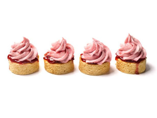Spread a layer of strawberry preserves on the cake rounds. Transfer the rhubarb cream to a piping bag fitted with a large star tip. Pipe the cream onto the cakes.