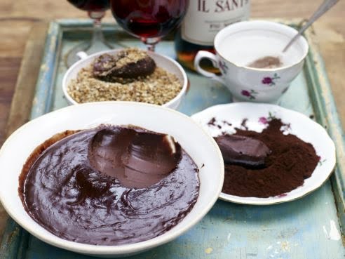 Put your mixed nuts into a plastic bag and use a rolling pin to bash them up quite finely. Get some little saucers or bowls and put the nuts in one and your cocoa powder in the other. Put a teacup filled with boiled water on the tray and pop a few teaspoons in there for scooping the chocolate. Get everyone around the table to spoon their own truffles out of the serving dish and roll them in cocoa powder, crushed nuts or anything else you fancy. Or, you can let them smear their truffles over a biscotti like some posh Nutella! Serve with a few glasses of your chilled Vin Santo.