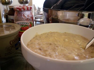 After the two are well blended, return to the burner, and bring to a boil for about a minute. Be sure and keep stirring, so that the fat does not separate from the liquid.