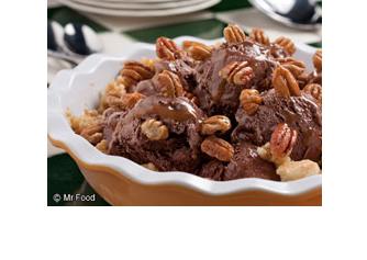 Into each scoop of ice cream, place 2 pecan halves in the front and 2 pecan halves in back, making "legs," and 1 pecan half on top, making the "head" of a turtle. Sprinkle with one- fourth of the cookie mixture then top with additional scoops of ice cream and pecans, continuing in a pyramid shape until all ingredients are used.