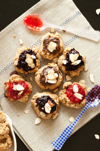 Combine all ingredients (except for the filling) in a large bowl. Form into rounded tablespoon-sized balls and space them evenly on a parchment-lined baking sheet. Use your thumb to make an indentation in each cookie.
