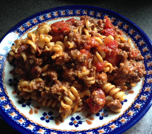 In a large skillet, and the ground beef and basil (just enough to season the meat); Brown the ground beef with until it is no longer pink in the center, chopping the meat into small pieces as it cooks. Add the diced tomatoes (*with the juices*) and the tomato soup to the meat; Simmer for 5 minutes to infuse the flavors. Add the noodles to the meat mixture and mix together thoroughly. Sprinkle paprika over the top of the skillet (enough to cover all the noodles and meat) and mix it into the goulash; Simmer for 7-10 minutes. Add more paprika (if desired) and simmer for an additional 5-8 minutes. Sprinkle with Parmesan Cheese and serve hot.