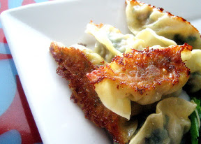 Place scant 1 T filling in the center of each gyoza wrapper, lightly moisten outside edge of wrapper with a bit of water. Fold wrapper in half to enclose filling, pinching center and each end to make a tight seal. Holding wonton in hand, seal remaining edges, pinching dough towards center, forming a couple of small pleats. Press sealed edge down lightly to plump up dumpling and make it stand up straight. (At this point, you can freeze them. Just cook like normal, but add an additional 1/4 c water and increase cooking time slightly.)