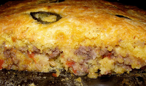 Mix the second box of Jiffy mix and corn together and pour over meat mixture. Top with cheese and chopped jalapeños.