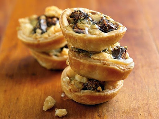 2. In small bowl, mix figs, brown sugar, cinnamon and walnuts. Spoon slightly less than 1 teaspoon fig mixture into each cup. Break up any larger pieces of cheese. Top each tartlet with slightly less than 1 teaspoon cheese.