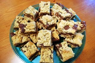 Pour the warm chocolate over the oatmeal crust, the scatter remaining oatmeal over top.