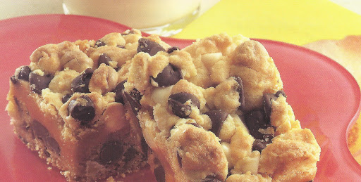 Heat oven to 350 F. Grease 13x9 inch pan. In large bowl, combine cake mix, oil, and eggs. Blend well. Stir in chocolate chips, vanilla chips and candy bar pieces. (Mixture will be thick) Press half of mixture in bottom of greased pan. Bake at 350 F for 10 minutes.