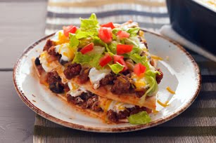 ARRANGE 3 tortillas in single layer on bottom of 13x9-inch baking dish. Cover with layers of half each meat mixture, sour cream and cheese. Repeat layers; cover.