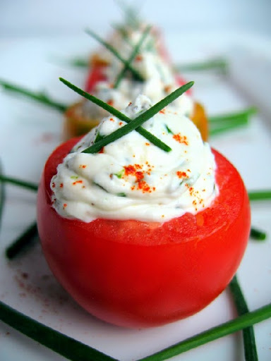 Cut a thin slice of the top of each tomato. Scoop out and discard pulp. Invert the tomatoes on a paper towel to drain. Meanwhile, combine remaining ingredients in a small bowl. Spoon into tomatoes. Refrigerate until serving.