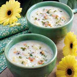 In the same skillet, saute onion in reserved drippings until tender. Stir in soup and milk. Add the clams, lemon juice, thyme, pepper and bacon; cook until heated through. Garnish with parsley.