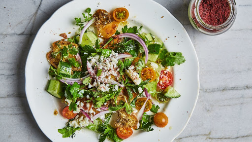 Toasty pita chips, crisp romaine, and cool cucumbers make for a Middle Eastern–style salad recipe that comes together on the fly.