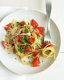 Drain spaghetti in a colander. (Do NOT rinse). Add to tomato mixture. Toss to combine. Garnish with basil you saved for garnish, and serve immediately.