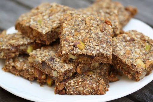 Transfer the dough to the prepared baking pan, and press down firmly into a flat layer. Bake for 30 minutes. Remove from oven and let cool before cutting into 16 2x2-inch squares. When wrapped, energy bars will keep up to a week.