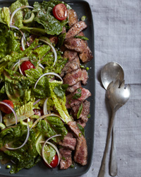 Meanwhile, in a bowl, toss the romaine with the cherry tomatoes, cucumber, onion, scallions, basil and cilantro leaves. Pour two-thirds of the dressing over the salad and toss. Divide among 4 plates. Slice the steak 1/3 inch thick across the grain and serve alongside the salad. Pass the remaining dressing at the table.